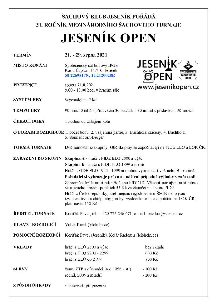 31. ROČNÍK MEZINÁRODNÍHO ŠACHOVÉHO TURNAJE: JESENÍK OPEN