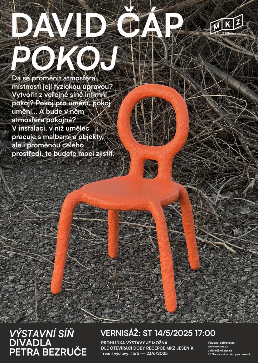 Bude v instalaci Pokoj atmosféra pokojná? Záleží na záměru – nechme se překvapit, jaký záměr do své výstavy David Čáp vložil. Ve své tvorbě osahává hranice malby, sochy i interiérového designu hravě a se zvědavostí průzkumníka. David Čáp je umělec samouk, kterého vášeň pro estetiku svedla z cesty počítačového programátora a ukázala mu, že i funkční věc může mít osobnostní kouzlo.