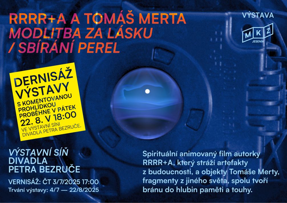 Přijďte se ponořit do duchovního animovaného filmu, který stráží artefakty z budoucnosti. Díla RRRR+A mluví o věčnosti, krvi a síle Lásky – prastaré síle, která přetrvává věky věků. Jsou vizuálními básněmi, kde obraz, pohyb a zvuk otevírají prostor mezi zrodem a zánikem. Doprovázeny jsou objekty Tomáše Merty. Výstava je náhledem do světa, kde dva umělci rozdílných pohlaví demonstrují možná propojení dvou zdánlivě rozdílných světů, objektů a filmu.