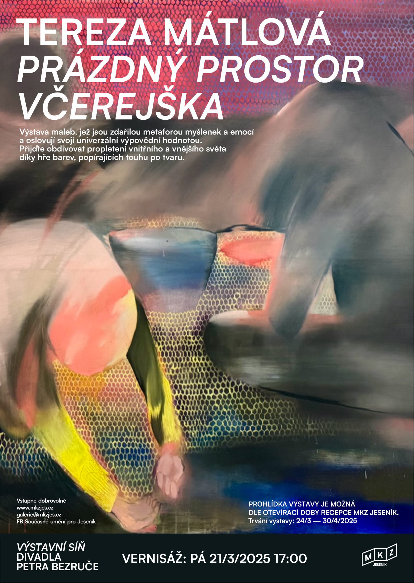 Barva popírající touhu po tvaru, a přesto umožňující jeho vyřčení. Pestrá pole pláten vybízející zrak k tomu, aby vstupoval do spodních vrstev a snažil se nalézt obrysy přemalovaných tvarů, tolik nečitelných, a přitom jasně prosvítajících. Obrazy Terezy Mátlové (*1996) jsou zdařilou metaforou vlastních myšlenek a emocí, které však oslovují svojí univerzální výpovědní hodnotou. Přijďte se o tom ostatně přesvědčit sami a stát se součástí pozoruhodného dialogu, v němž se každé tenké vlákno stává nositelem slov a kde se díky citlivé práci s barvami stírá či proplétá hranice vnitřního prožitku a vnějšího světa.