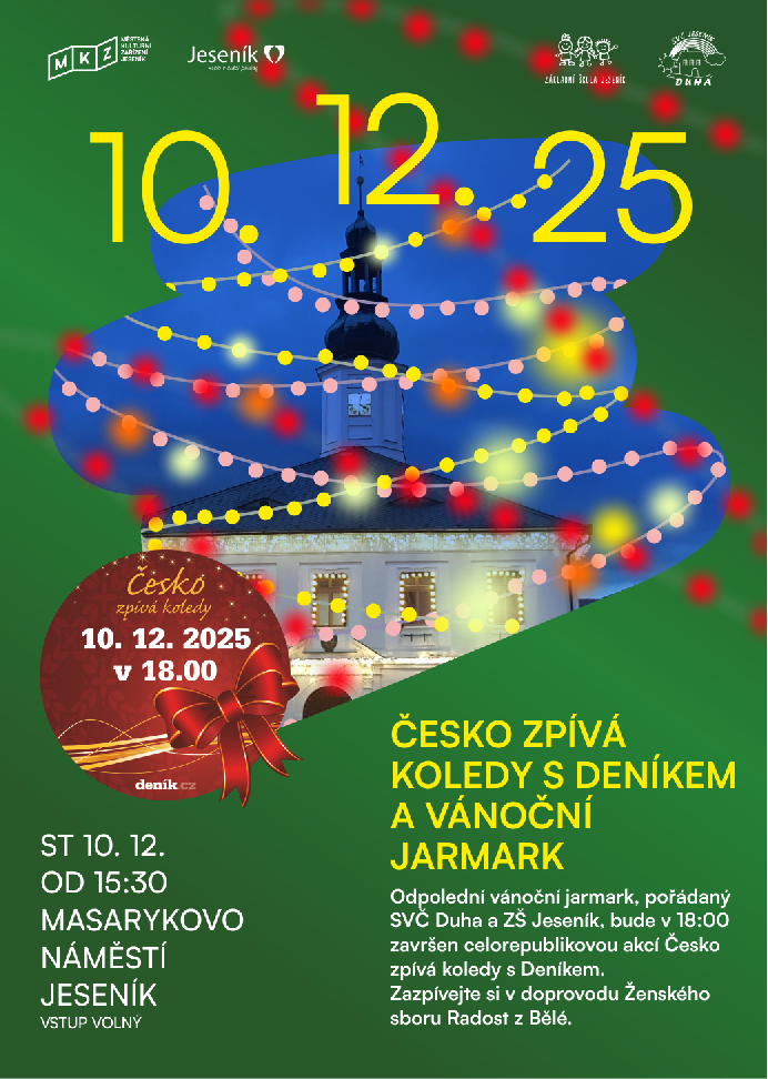 Odpolední vánoční jarmark, pořádaný SVČ Duha a ZŠ Jeseník, bude v 18:00 završen celorepublikovou akcí Česko zpívá koledy s Deníkem.