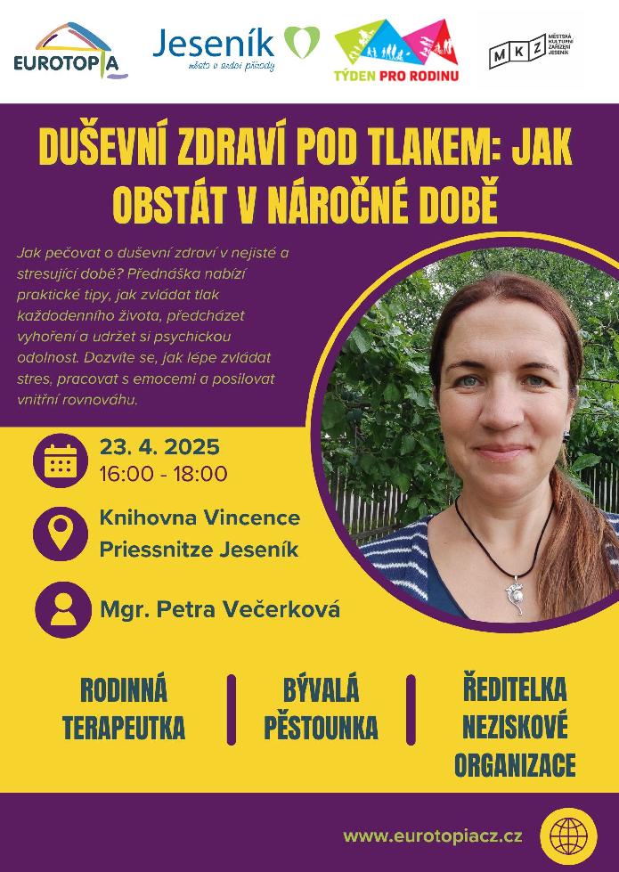 Přednáška nabízí tipy, jak zvládat tlak každodenního života, předcházet vyhoření a udržet si psychickou odolnost. Dozvíte se, jak lépe zvládat stres a pracovat s emocemi a posilovat vnitřní rovnováhu.