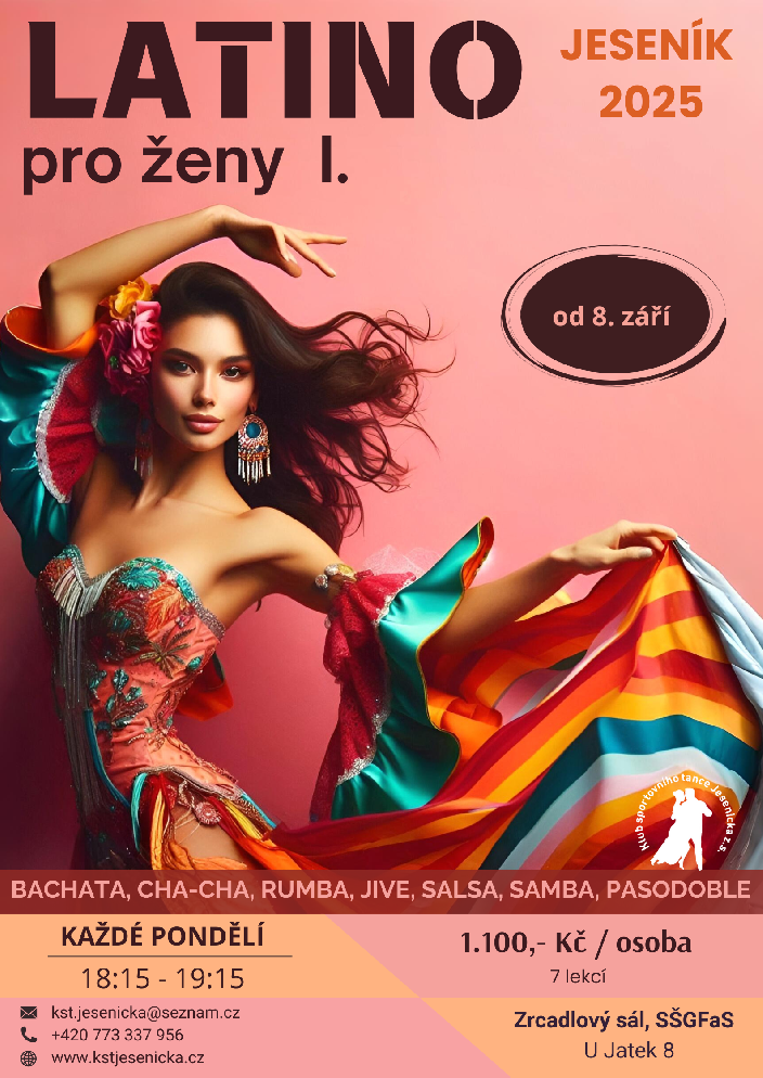 A co tě na kurzu čeká? Naučíš se základní kroky tanců jako bachata, cha-cha, rumba, jive, salsa, samba, pasodoble. Osvojíš si správné držení těla, ladnou chůzi a pohyby. Zvládneš jednoduché taneční sestavy. Kurz povede a roztančí tě Veronika Pavlišťová. Kurzovné činí 1 100 Kč a lze uhradit on-line nebo na prodejních místech MKZ Jeseník do 7. 9. 2025. Je však třeba vyplnit a zaslat na níže uvedený e-mail tuto PŘIHLÁŠKU.