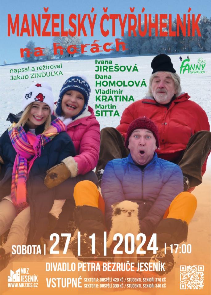 Zveme Vás na divadelní představení Manželský čtyřúhelník na horách, který volně navazuje na osudy čtyř protagonistů z komedie Manželský čtyřúhelník. Ta se dočkala přes 200 repríz, nedaly spát ani Fanny agentuře, ani autorovi. Proto se Jakub Zindulka zamyslel nad tím, co z našeho běžného života se do prvního dílu nevešlo. Kdo má vynášet smetí, proč se chlapi nikdy neptají na cestu a jak se správně vymačkává zubní pasta? Nejen to budeme řešit na horské chatě před Vánocemi.