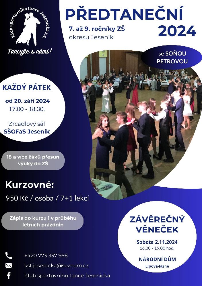Běžné lekce budou probíhat každý pátek od 17.00 do 18.30 hod. v našich prostorách na SŠGFaS, U Jatek 8, Jeseník (zelená budova - 1. poschodí). Máme u nás k dispozici 2 taneční sály s kvalitním ozvučením, audiovizuální technikou a zrcadly, které napomáhají výuce. Předtaneční budou ukončeny společným slavnostním závěrečným VĚNEČKEM s ostatními ZŠ okresu Jeseník v sobotu dne 2.11.2024 v prostorách Národního domu Lipová-lázně v čase od 16:00 do 19:00 hod., kde budou rodiče, příbuzní a jejich známí a rovněž široká veřejnost srdečně vítáni.