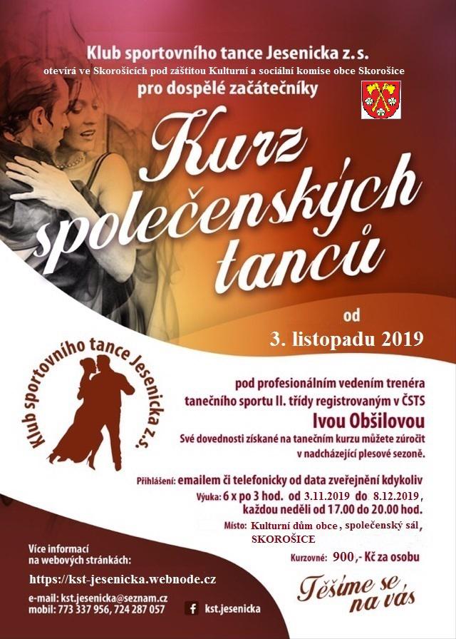 Začínáme již 3.11.2019 v Kulturním domě ve Skorošicích. Kurz povede Iva Obšilová, trenér tanečního sportu II.třídy registrovaný v ČSTS. Naučíte se zde základy latinsko-amerických a standardních tanců. Své dovednosti získané na tanečním kurzu můžete zúročit v nadcházející plesové sezoně.