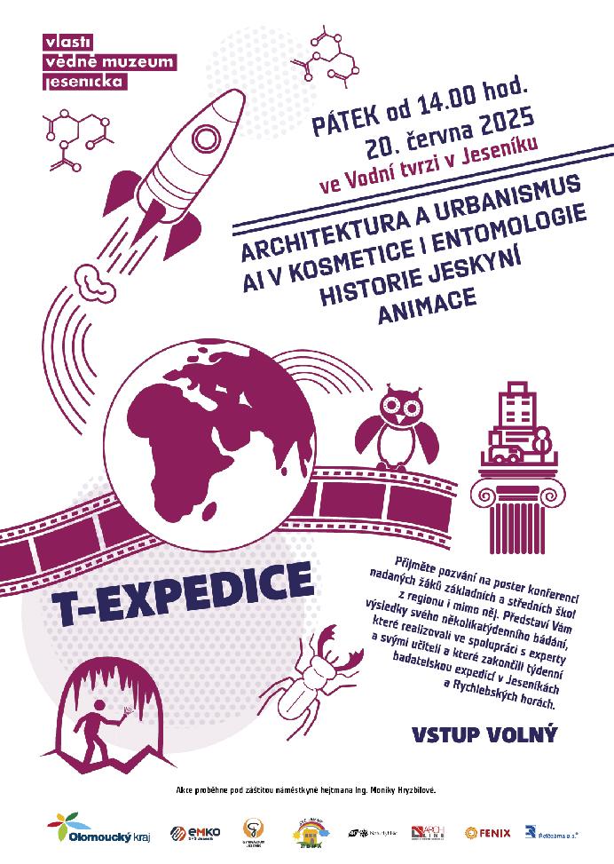 Dne 20. června 2025 proběhne od 14.00 hod. na nádvoří Vodní tvrze a v Rytířském sále prezentace výsledků badatelských sekcí T-expedice Jeseníky 2025. Zvídaví žáci z regionu Jesenicka, doplnění o přespolní posily, představí výsledky svého několikaměsíčního bádání, které zakončí týdenní prezenční aktivitou v Jeseníkách a Rychlebských horách. Přijďte podpořit mladé badatele, od nichž se dozvíte nové poznatky z přírodních, humanitních i technických disciplín vztažené k našemu regionu.