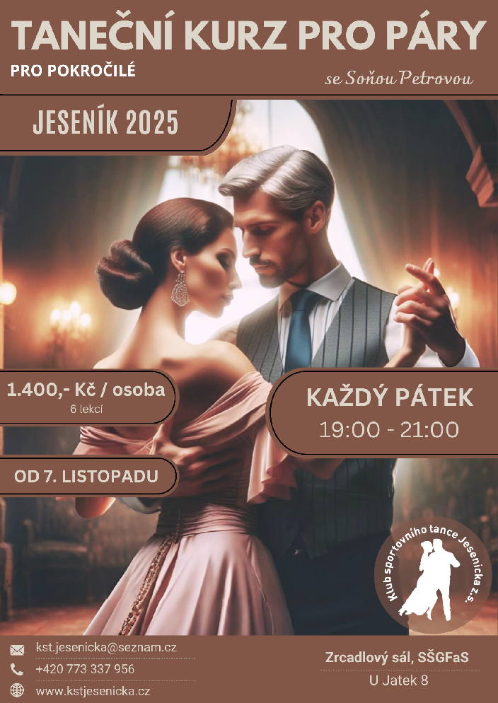 Taneční kurz se rozběhne 7. listopadu 2025. Kurz je rozvržen do 6 lekcí po 2 hodinách. Lekce budou probíhat každý pátek od 19.00 do 21.00 hod. v našich prostorách na SŠGFaS, U Jatek 8, Jeseník (zelená budova - 1. poschodí). Máme u nás k dispozici 2 taneční sály s kvalitním ozvučením, audiovizuální technikou a zrcadly, které napomáhají výuce. V průběhu celého kurzu je dovolené malé občerstvení.