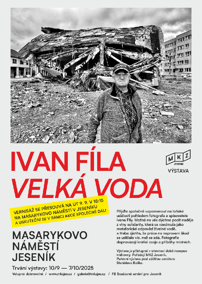 Přijďte si připomenout loňské události pohledem fotografa Ivana Fíly. Možná na vás dýchne pocit naděje z vlny solidarity, která se vzedmula jako metaforická odpověď živelné vodě, a třeba zjistíte, že práce vedoucí k napravení škod se udělalo víc, než se zdá.